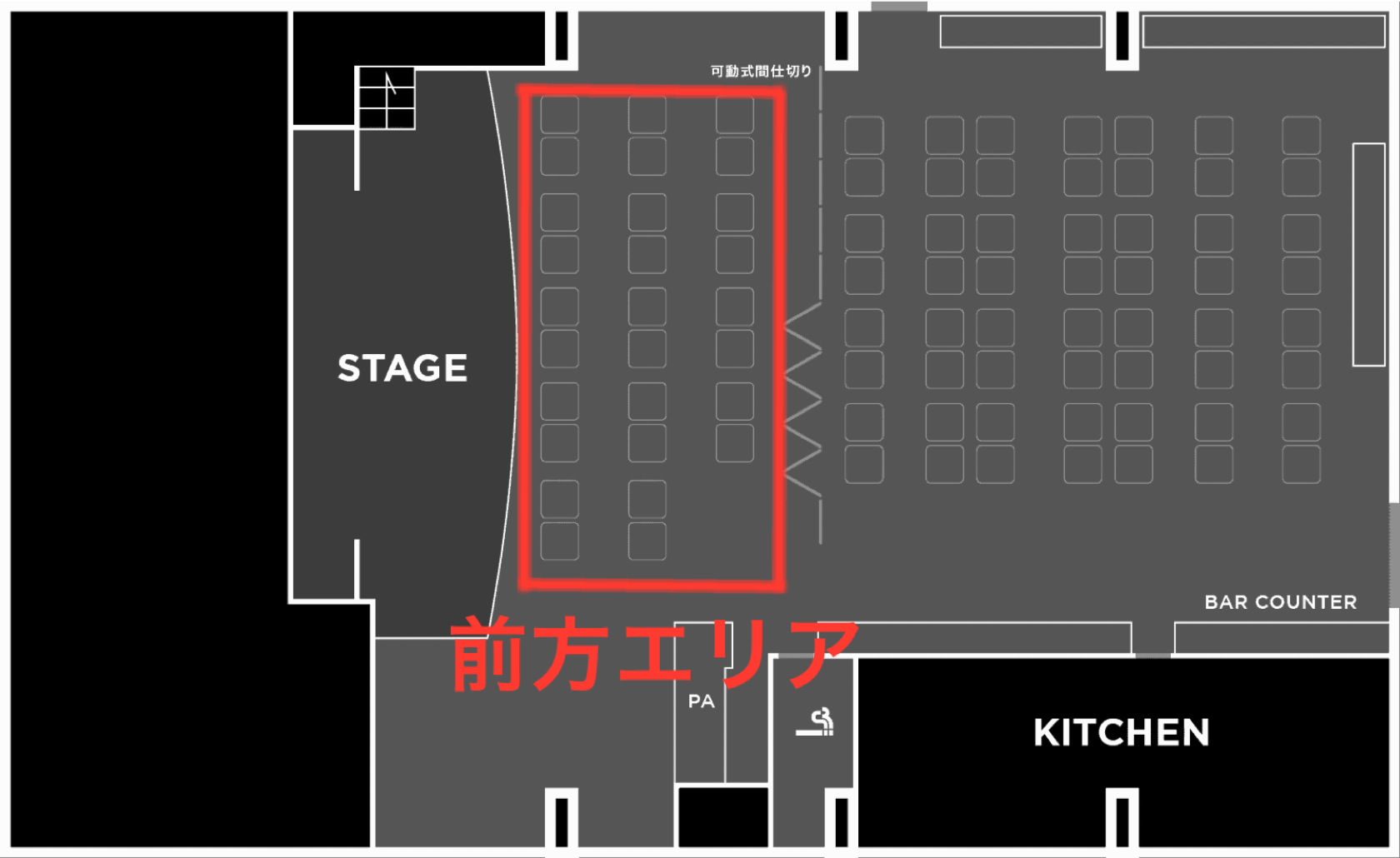 上記前方エリアが前方確約指定席の場所となります